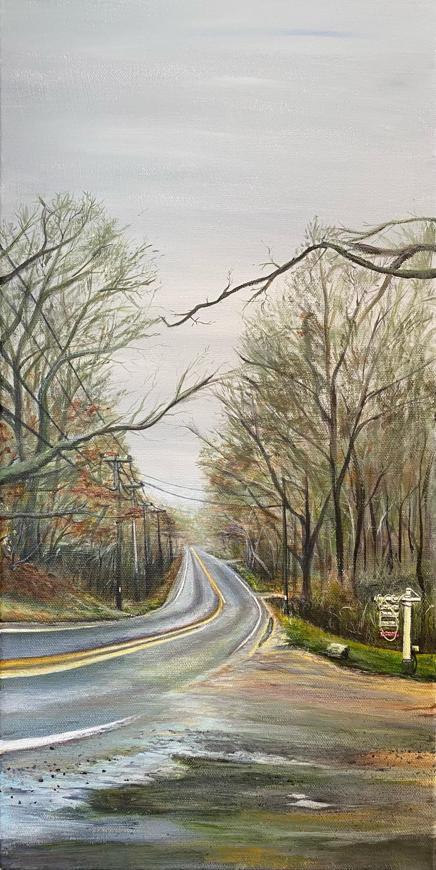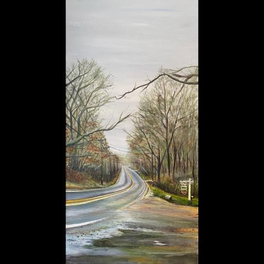 Original acrylic painting by Saundra LaBell depicts State Rd, passing Scottish Bakehouse in Vineyard Haven, on Martha's Vineyard.